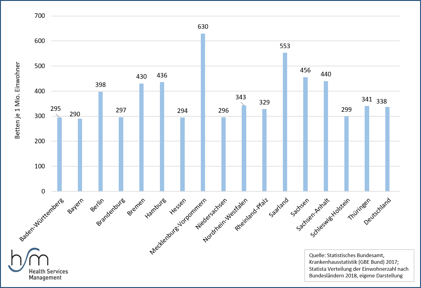 Die Anzahl variiert zwischen 294 intensivmedizinischer Betten je 1 Millionen Einwohner in Hessen und 630 in Mecklenburg-Vorpommern. Im Schnitt gibt es 338 Betten der intensivmedizinischen Versorgung je 1 Millionen Einwohner in Deutschland.