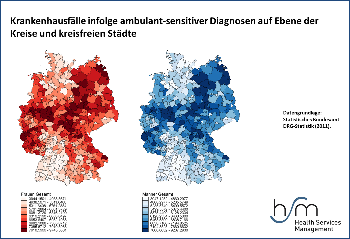 Dem Konzept der ambulant-sensitiven Diagnosen liegt die Annahme zugrunde, dass Krankenhausfälle infolge bestimmter Diagnosen durch effektives Management chronischer Erkrankungen, effektive Akutbehandlungen im ambulanten Sektor oder Immunisierungen vermieden werden können. Gemäß dieser Annahme weist eine erhöhte Rate ambulant-sensitiver Krankenhausfälle auf Defizite im Zugang zum oder der Qualität im ambulanten Sektor hin. Die aktuelle Grafik veranschaulicht die geographische Verteilung der altersstandardisierten Krankenhausfälle für 22 ambulant-sensitive Kerndiagnosegruppen je 100.000 Einwohner für Frauen und Männer auf Kreisebene in Deutschland. Die dunkelsten Schattierungen zeigen jene Kreise, welche am meisten Krankenhausfälle aufweisen, während die hellsten Schattierungen jene mit den wenigsten Krankenhausfällen kennzeichnen. Die Methodik der Auswahl des vorliegenden Katalogs ambulant-sensitiver Krankenhausfälle sowie potentielle Maßnahmen zur Reduzierung werden in dieser Studie beschrieben.